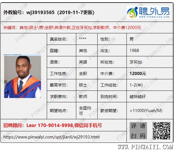 外教招聘快讯:每日外教推荐2019年11月8日出自:聘外易