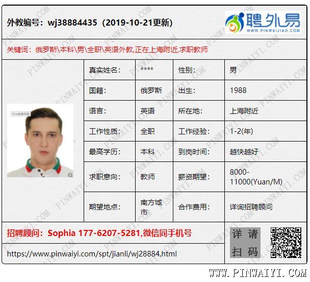 大家好!相信大家对我们的外教都很感兴趣,想要更深一步的了解我们的外教学历和个人情况,那么小编就来满足你们的愿望啦,我会每天都为大家推荐一些优质的外教,每天哦!有需要的老师要多多关注专题频道,相信总有一个外教适合你的学校!话不多说,开始推荐! 俄罗斯, 在无锡, 求职南方(广东省工作)工作, 商务签可以自理,立马可以到薪资 10-12 口音清晰,工签资料全, 现在在广州天河区, 求职天河区附近,不要住宿 想要白天工作的职位, 经验很丰富,教学多年,喜欢孩子, 有责任心 摩洛哥,在佛山,英语语言学学士学位,酒店管理类工签转聘,性格好,有教学经验,求职佛山或广州,11月中旬到岗,期望薪资14k+住宿 塔吉克, 女,在北京,学士学位,学生签,TESOL,求职北京,尽快到岗,和男朋友同一所学校俩人一个住宿 以上就是今天小编推荐的外教啦! 如果没有您看上的,可以打开我们的外教库,有海量外教供您选择! 您也可以直接发送招聘需求给我们,我们会根据您的要求为您精心挑选外教! |