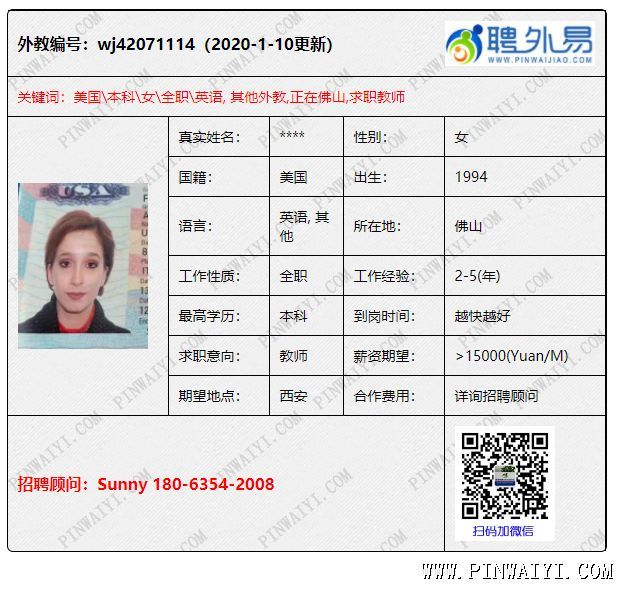 大家好!相信大家对我们的外教都很感兴趣,想要更深一步的了解我们的外教学历和个人情况,那么小编就来满足你们的愿望啦,我会每天都为大家推荐一些优质的外教,每天哦!有需要的老师要多多关注专题频道,相信总有一个外教适合你的学校!话不多说,开始推荐! 本科学历,教学经验丰富,做活动活泼有趣,现有商务签 外教教学经验丰富,口音很好。求职地不限。年后到岗。 Gerard南非,本科,在南非,Tefl,工签资料已经认证(还差无犯罪需要更新下),求职南方城市,可以去很小城市,薪资可协商 工签转聘, 口音好形象佳, 只在西安, 各种类型学校都行 Nata和朋友Veronika+俄罗斯美女+本科+自理商务签(3个月)+求职南方城市,广州最好,或附近+目前在本国,可马上到岗~Nata发音比较好(不低于11k就行) 以上就是今天小编推荐的外教啦! 如果没有您看上的,可以打开我们的外教库,有海量外教供您选择! 您也可以直接发送招聘需求给我们,我们会根据您的要求为您精心挑选外教! |
