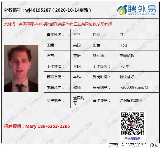 外教招聘快讯:每日外教推荐2020年10月16日出自:聘外易