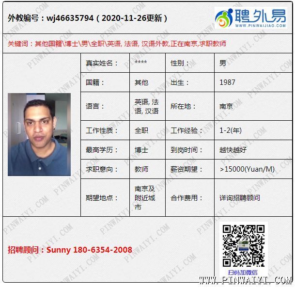 埃及男,本科,求职下午兼职和周末全天或者培训机构工作,目前在广州
