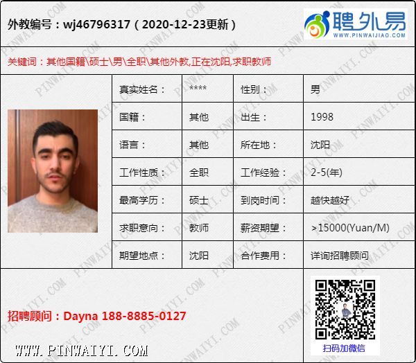 阿富汗男,全职,求职沈阳沈河区,目前在沈阳