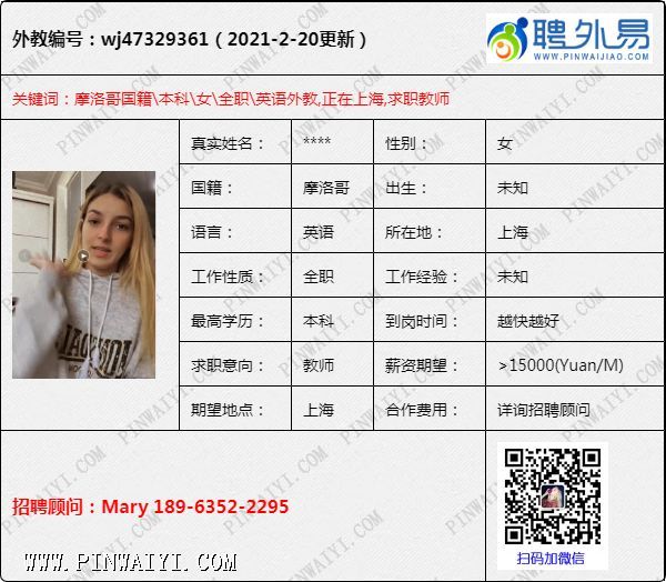 硕士外教,在大使馆做过行政秘书,现在上海,求职地不限制
