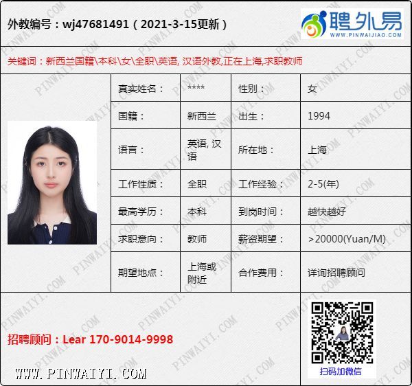 新西兰外教,本科学历,在上海,求职上海或江浙地区,24k+