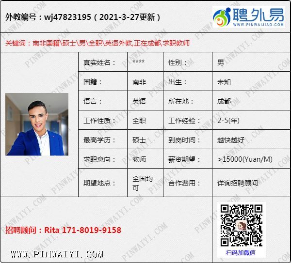 南非外教,工签转,在广州,求职广州、深圳,不去培训
