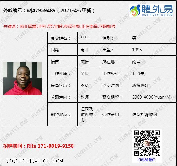 南非,现居南昌,求职幼儿园或培训中心,城市南昌及周围城市