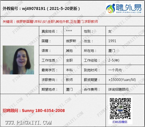 白俄罗斯女,本科,求职厦门,目前在厦门,4年经验