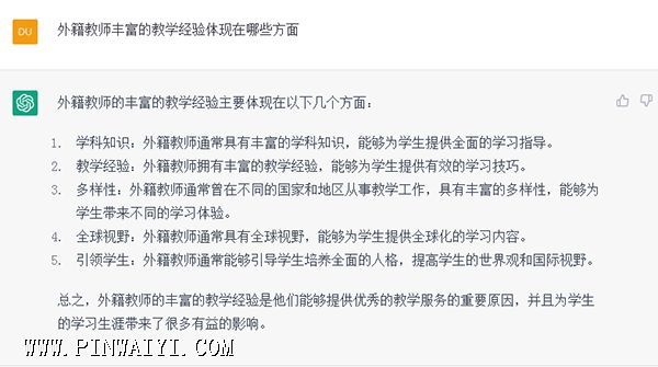 外教在中国越来越被认可,ChatGPT怎么看 台州的一所招聘学校,需要幼儿园、小学、初中体育外教,要求母语(母语外教),必须具有教师证书或者TEFL;薪资16k-28k,提供校内公寓或者每月2200元补贴,免费的早餐和午餐;另外,还有合同年度奖金、航班报销、结算津贴和其他奖金。 每天都会有很多的招聘学校跟我们对接外教招聘的相关事宜。近年来,越来越多的学校招聘外教进行授课,有的需要从事英语教学的英语外教,有的则需要从事体育、舞蹈等学科教学的学科类外教。外教在教学中的优势也越来越突出,得到很多家长的认可。 外教在中国越来越被认可,我们来看一下ChatGPT是怎样看待这个问题呢?