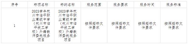 关于2023学年杭州市临平职业高级中学(杭州市临平技工学校)外籍教师委托服务项目中标(成交)结果公告 一、项目编号:YJZFCG2023-108 二、项目名称:2023学年杭州市临平职业高级中学(杭州市临平技工学校)外籍教师委托服务项目 三、中标(成交)信息 1、中标结果: