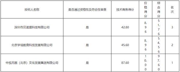四、候选中标供应商名单: 中视方圆(北京)文化发展集团有限公司 北京学培教育科技发展有限公司 深圳市贝诺盛科技有限公司 五、中标信息 供应商名称:中视方圆(北京)文化发展集团有限公司 供应商地址:北京市石景山区石景山路甲18号院3号楼16层1813 中标金额:人民币贰拾万零陆仟玖佰柒拾柒元陆角整(¥206,977.60) 六、主要标的信息: