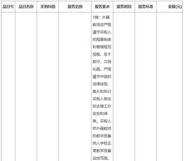 七、公告期限 自本公告发布之日起1个工作日。 八、其他补充事宜 合同包1(知识城校区外籍教师教学服务):
