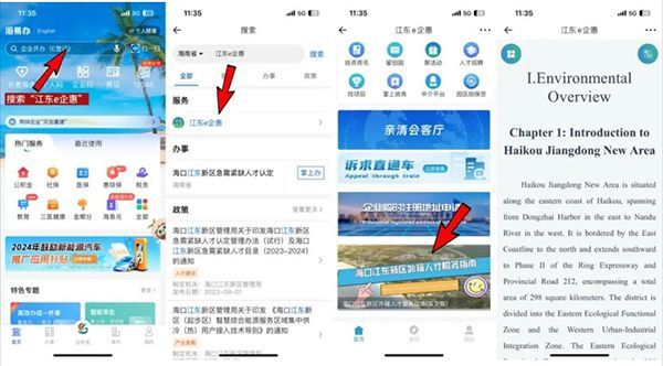 The "Haikou Jiangdong New Area Expat Talent Service Guide" is divided into two main sections: an Environmental Overview and a Practical Guide. It covers a wide range of topics, including how to obtain a work visa, register for accommodation, complete medical certification, apply for a work permit in China, obtain a residence permit, and acquire housing and vehicles, as well as healthcare and education services. The guide provides clear, convenient, and visual information and service resources that expatriate talent needs for work, life, and entertainment in Jiangdong. This guide is currently available online through the Jiangdong e-QiHui. 02线上查询步骤Online Inquiry Steps ① 下载“海易办”APP,准备有效的个人国际护照和手机号码,从您的移动应用商店下载海易办,以苹果的应用商店为例,搜索“海易办”,然后点击下载; ② 登录“海易办”主页面,搜索“江东e企惠”,或通过“自贸江东”微信公众号的“江东服务”功能栏,进入海易办“海口江东新区旗舰店”功能区,在主页面点击“江东e企惠”板块; ③ “江东e企惠”主页面点击《海口江东新区外籍人才服务指南》板块,即可在线查询或下载指南内容。