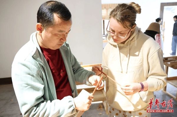 在桃花源的古韵氛围中,外教们动手研磨醇香擂茶,一捻一擂间感受古法技艺的匠心独运;飞针走线体验桃源刺绣,在丝线流转中触摸传统美学的温度。非遗传承人娓娓道来的文化故事,让剪纸、木雕等工艺背后的千年智慧跃然眼前。外教们纷纷表示,这种“手作”体验不仅让他们近距离感知了中国非遗的独特魅力,更搭建起了一座跨文化对话的桥梁。