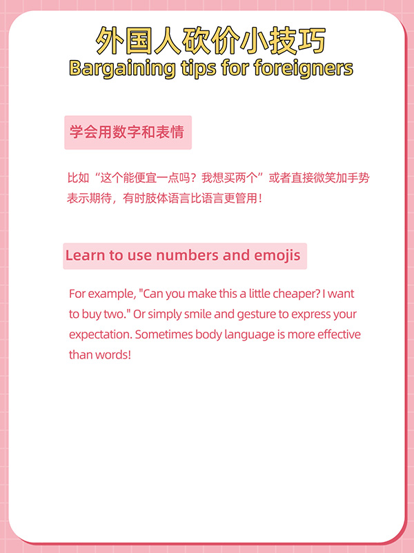 在中国购物,砍价其实也是一种文化体验。学会了这几招,你也能像本地人一样,买得开心又省钱! Shopping in China, bargaining is actually a cultural experience. By learning these tricks, you can also enjoy shopping happily and save money like a local! 外国人来中国必学第一招:砍价! |