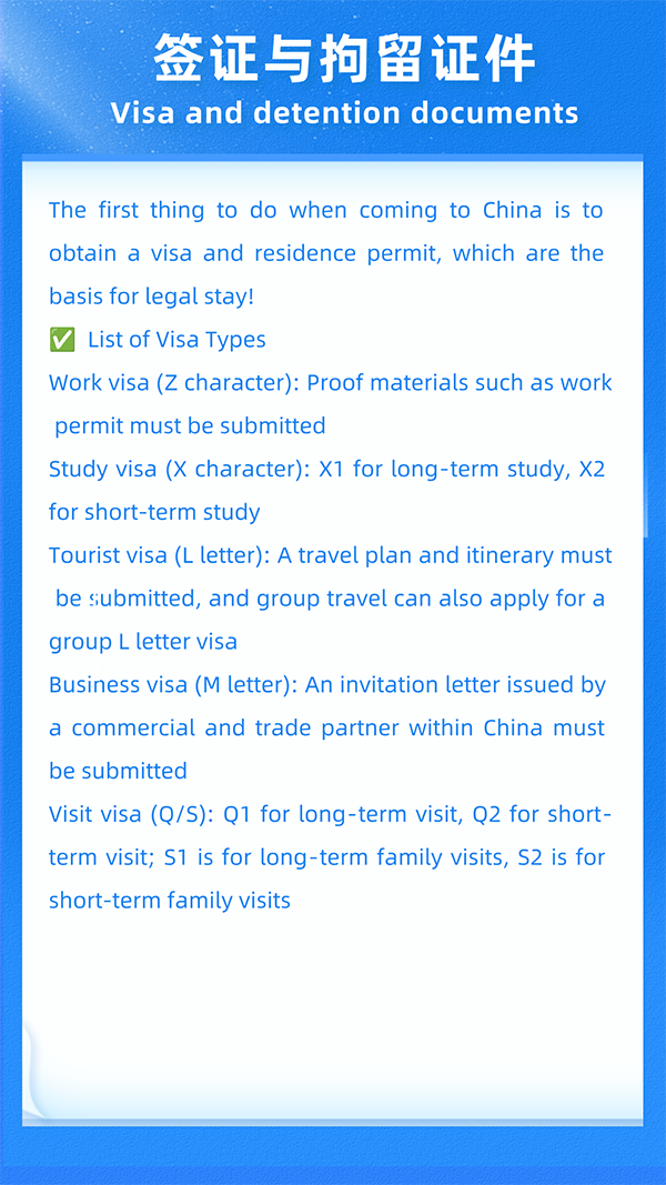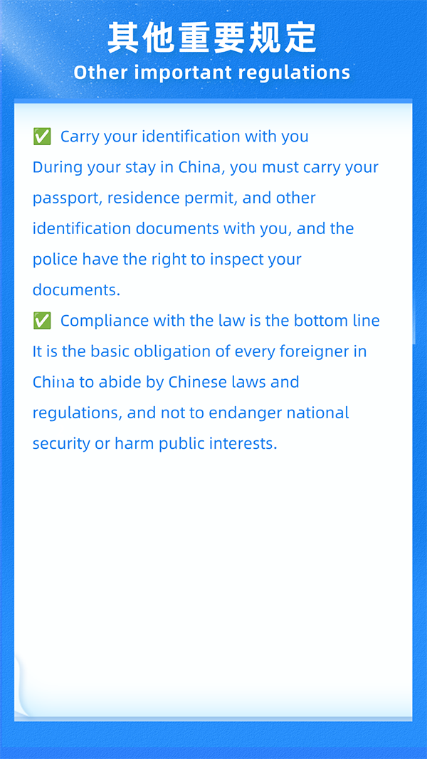 温馨小贴士 证件遗失、损毁、被盗抢要及时向公安机关申请补发; 签证停留期限可以申请延期,但累计延长不得超过原签证期限; 申请各类证件时材料不符合要求,工作人员会一次性告知需要补正的内容。 Warm Tips Lost, damaged, or stolen documents should be promptly applied for reissue to the public security organs; The visa stay period can be extended, but the cumulative extension shall not exceed the original visa period; When applying for various types of documents, if the materials do not meet the requirements, the staff will inform you of the necessary corrections in one go. 希望这份攻略能帮你更好地适应中国的生活!中国是个法治国家,只要遵纪守法,你会发现这里既安全又便利,人民友善,生活精彩! I hope this guide can help you better adapt to life in China! China is a country governed by the rule of law. As long as you abide by the law, you will find that it is both safe and convenient here, with friendly people and wonderful life! 外国人来华,这些法律法规要知道 |
